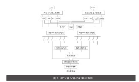 對于單電源設(shè)備來說,從兩套UPS冗余并機系統(tǒng)的輸出配電柜A和B分別送出兩路