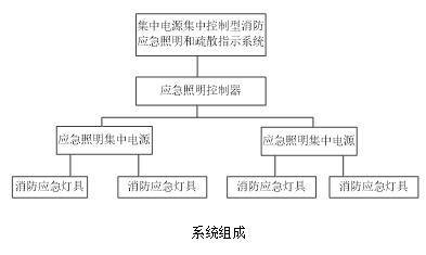 消防應(yīng)急照明和疏散指示系統(tǒng)由主機(主機)、集中電源(供電)和燈具(疏散指示燈、應(yīng)急照明燈)等幾部分組成。如下圖: