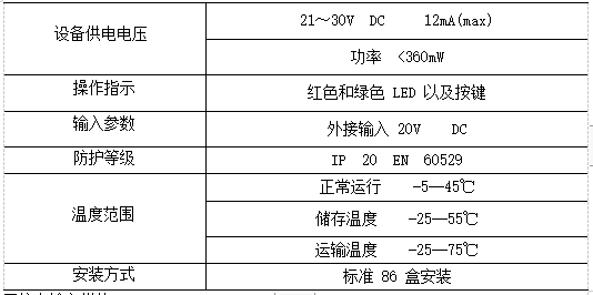 用于接受按鍵觸動(dòng)信號(hào),可通過(guò)區(qū)分短按與長(zhǎng)按并結(jié)合不同參數(shù)配置實(shí)現(xiàn)開(kāi)關(guān)、調(diào)光、場(chǎng)景、窗簾控制、調(diào)溫、報(bào)警等功能,電氣參數(shù)如下: