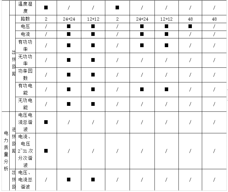 遙測(cè):電壓、電流、功率、電能、電纜溫度、漏電流、機(jī)柜溫度、機(jī)柜濕度、開(kāi)關(guān)狀態(tài)、電流/功率;
