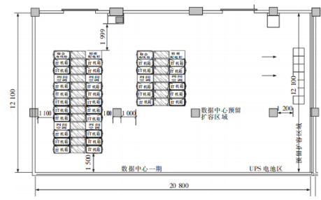 某煤礦模塊化數(shù)據(jù)中心的平面配置如圖 1 所示,某煤礦數(shù)據(jù)中心實(shí)景如圖 2 所示。 某煤礦數(shù)據(jù)中心共采購兩組 IDS 2000 雙 排模塊化數(shù)據(jù)中心,西側(cè)模塊數(shù)據(jù)中心包含一體化配電柜、行間空調(diào)、UPS 電源、雙回路電源輸入柜、UPS 電源輸出柜、空調(diào)電源柜,東側(cè)模塊數(shù)據(jù)中心包括配電柜、行間空調(diào)、中控、監(jiān)控和 ODF 配線柜,其中還在數(shù)據(jù)中心機(jī)房預(yù)留有擴(kuò)容區(qū)域。