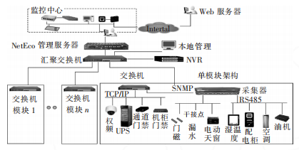 微模塊數(shù)據(jù)中心的機(jī)房管理采用 NetEco 基礎(chǔ)設(shè)施管理系統(tǒng),此系統(tǒng)由管理軟件和其他部件構(gòu)成,實(shí)現(xiàn)了對數(shù)據(jù)中心的溫濕度、空調(diào)系統(tǒng)、供配電系 統(tǒng)、UPS 后備電源、消防及監(jiān)控等多系統(tǒng)的數(shù)據(jù)采集與監(jiān)控,將各子系統(tǒng)和分散環(huán)節(jié)集中統(tǒng)一管理,為智 能化微模塊數(shù)據(jù)中心的全系統(tǒng)監(jiān)控提供了可靠保 障。NetEco 管理系統(tǒng)架構(gòu)圖如圖3 所示。